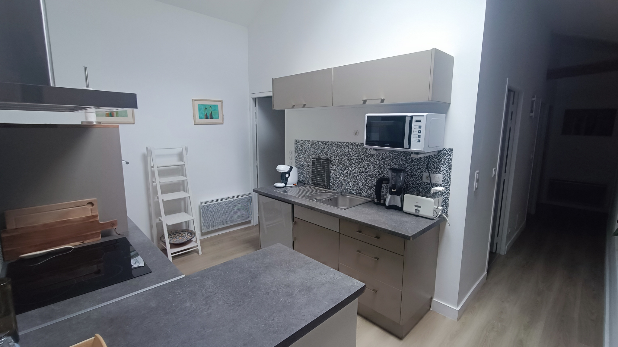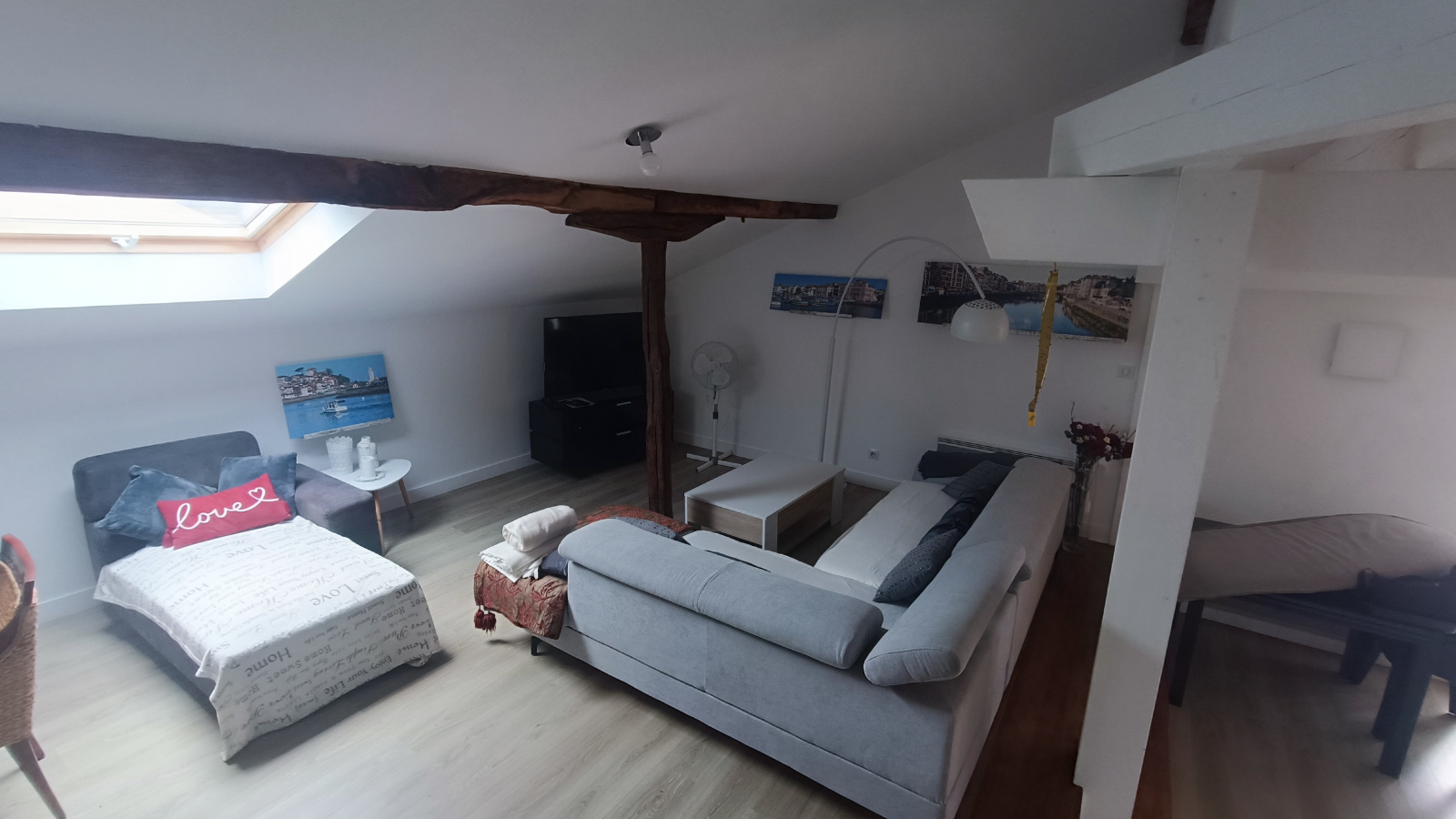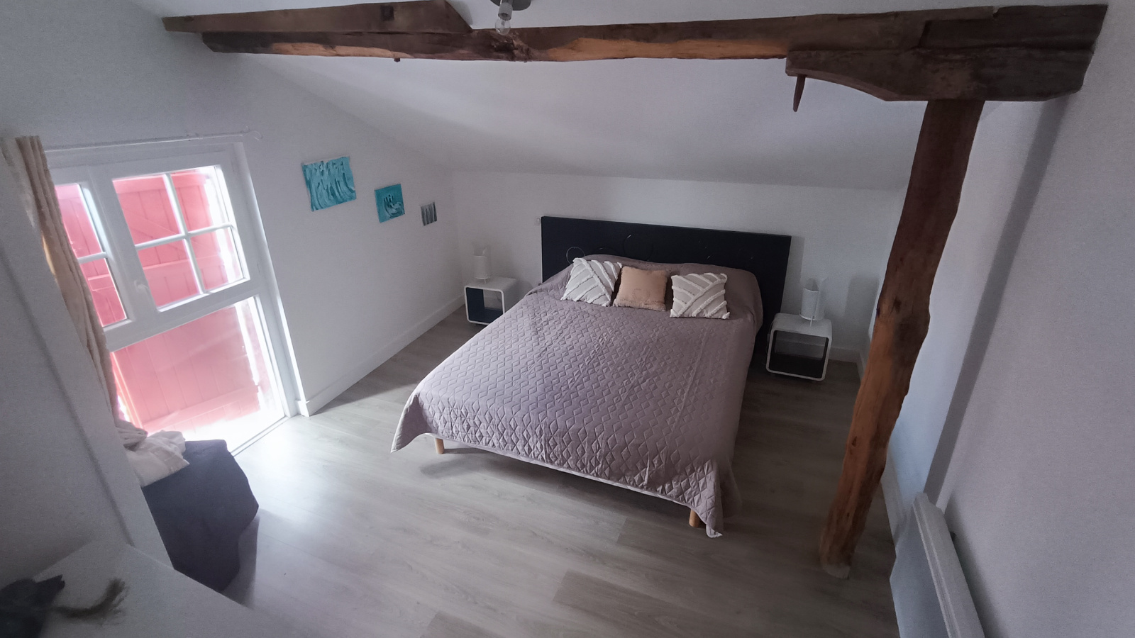 Dans un ancien corps de ferme rénové avec soin à Mendionde, à proximité d'Hasparren, bel appartement indépendant meublé avec poutres apparentes de 112.5m² au calme composé d'une belle entrée menant à un vaste séjour/salle à manger lumineux et convivial avec un poêle, une cuisine ouverte aménagée et équipée avec mise à disposition de l'électroménager (plaques de cuisson, four, hotte, réfrigérateur/congélateur, MO, LL, LV), un garde manger, une salle de bain, un WC séparé. 4 grandes chambres composent l'espace nuit dont une suite parentale avec salle d'eau/WC privatif,