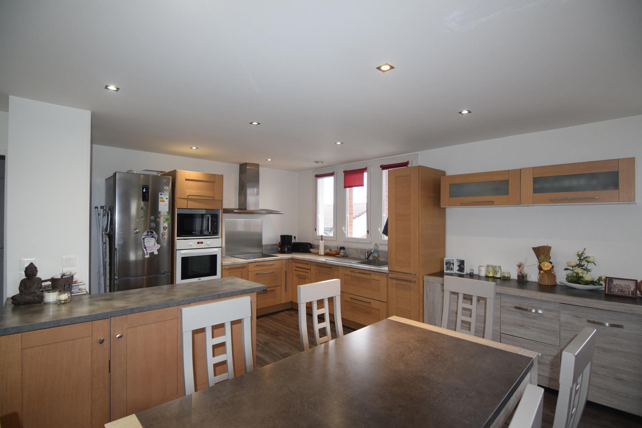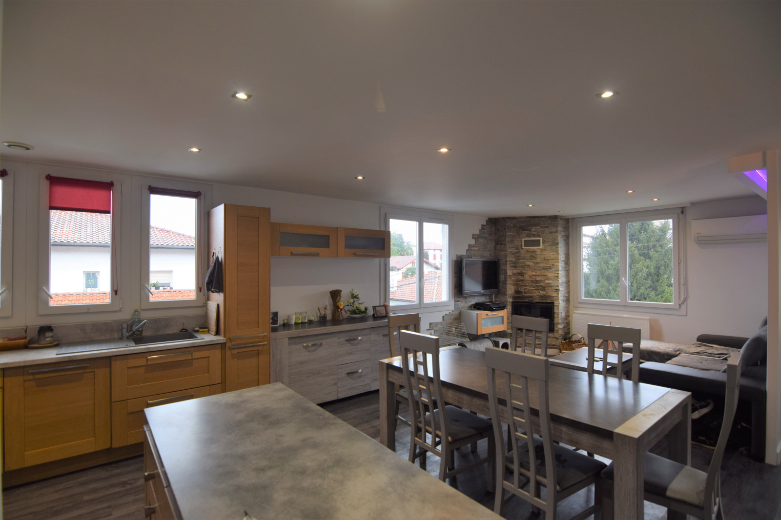 L’entrée se fait au premier étage sur la pièce de vie principale avec cuisine ouverte, salle à manger et salon avec sa cheminée insert.