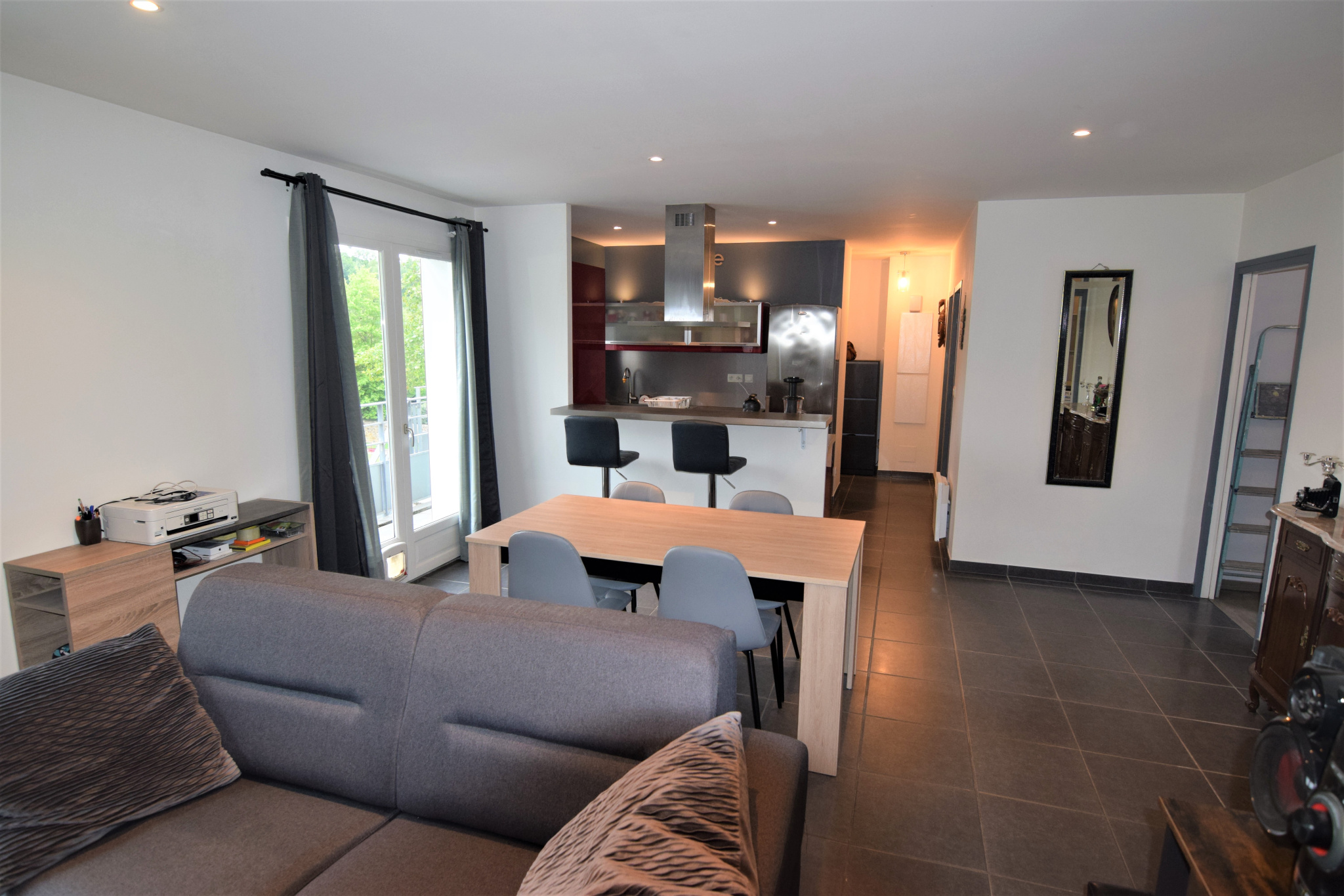 Entrée avec nombreux rangements donnant accès la pièce de vie principale et sa cuisine aménagée/équipée ouverte.
