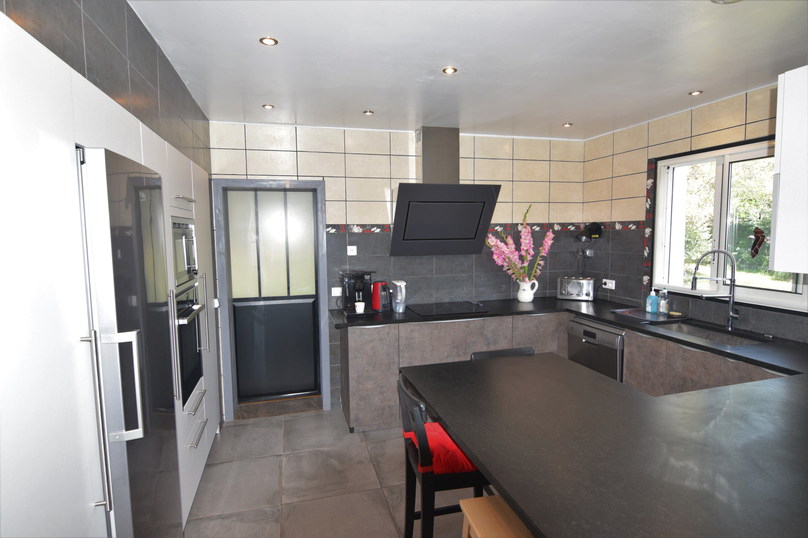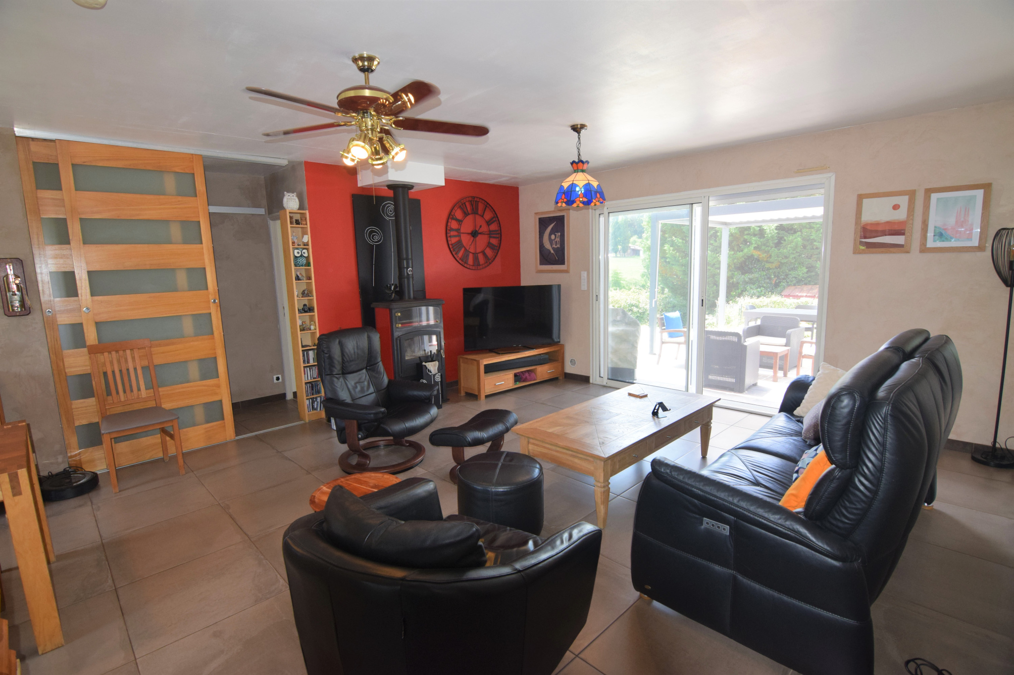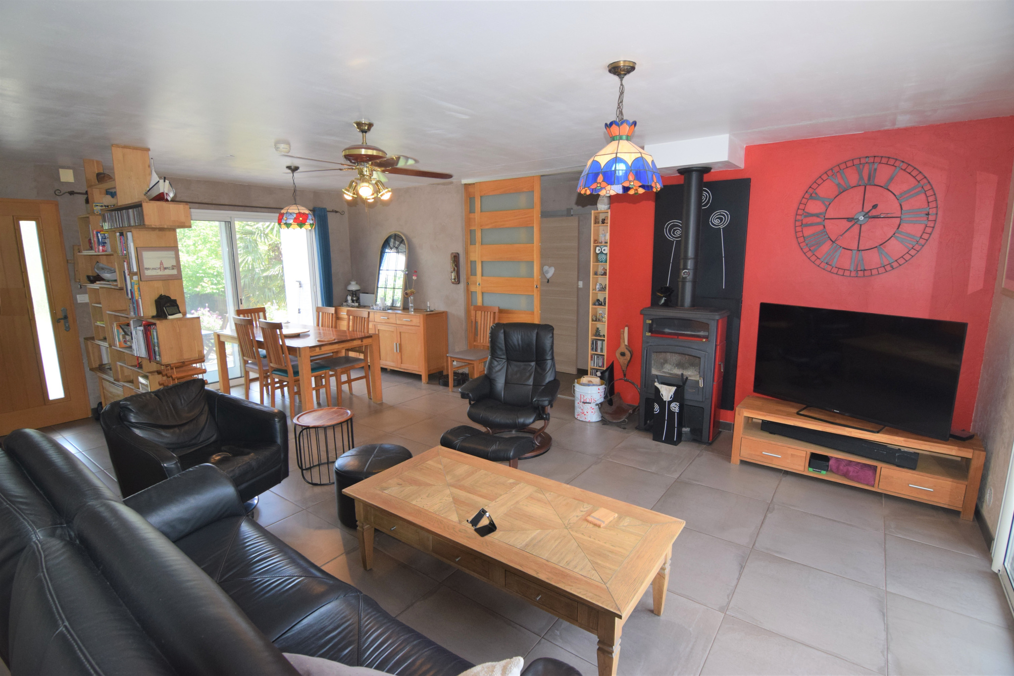 Entrée par la pièce de vie principale équipée d'un poêle à bois, cuisine complète neuve et ouverte sur le salon. Pièce à vivre très lumineuse grâce à ses nombreuses ouvertures traversantes.